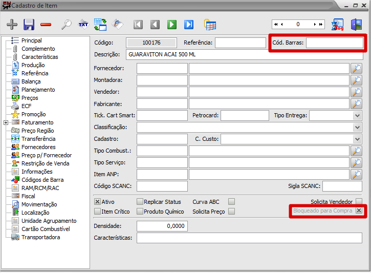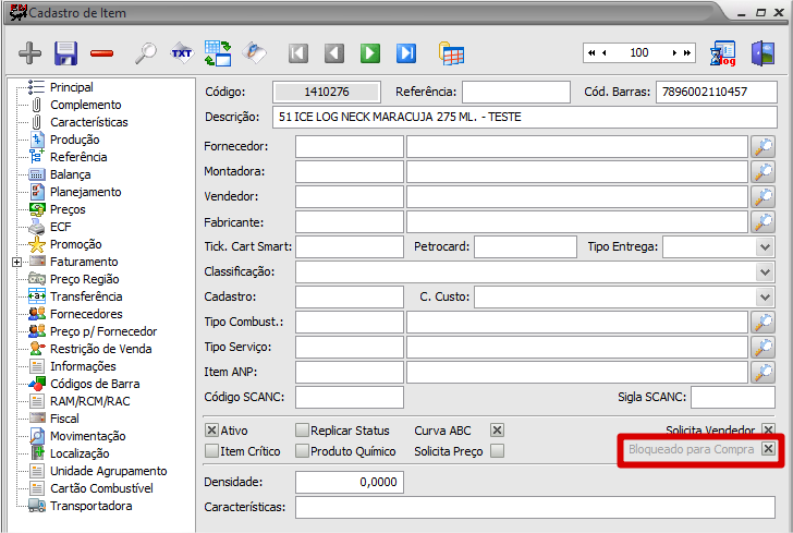Esses campos ficam desabilitados para evitar que o usuário faça a alterações que podem fazer fugir das regras estabelecidas pela Raizen. O revendedor quando utiliza o SelCon, não perde os itens que estão cadastrados na base, mas não fazem parte dos itens relacionados ao SelCon, esses itens, permanecem no banco de dados e disponíveis para venda, no entanto, são marcados com a opção: "Bloqueado p/ Compra", para que seja possível o cliente acabar com o estoque desses itens, como mostra na imagem.