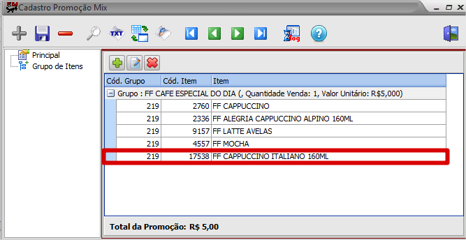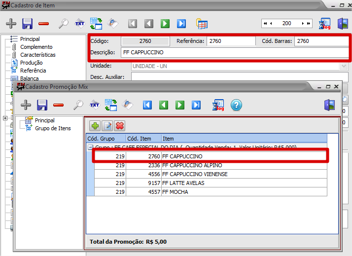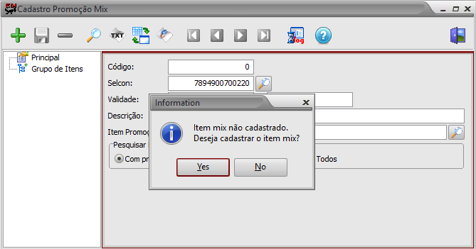 Deverá ser realizado o cadastro dos itens que participam da promoção, mas ainda não estão cadastrados no sistema, pegue o código de barras do item, e pesquise no cadastro de itens.