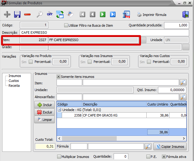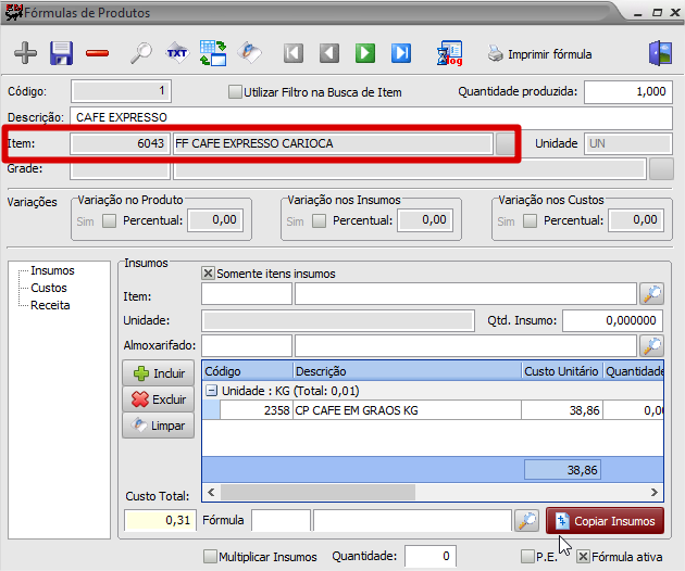 Após realizar a carga Full do SelCon, a Monitoria vai migrar a produção do item anterior para o item que receberá a migração, vai alterar o item da fórmula produto, como mostra na imagem.