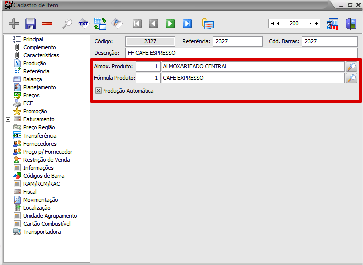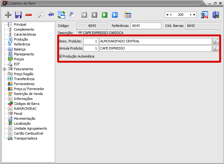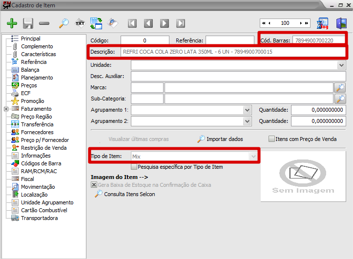Ao cadastrar o item mix, o sistema já vai abrir a tela dos itens com o nome do item, código de barras e o tipo do item já definido, restando apenas inserir os campos obrigatórios para concluir.