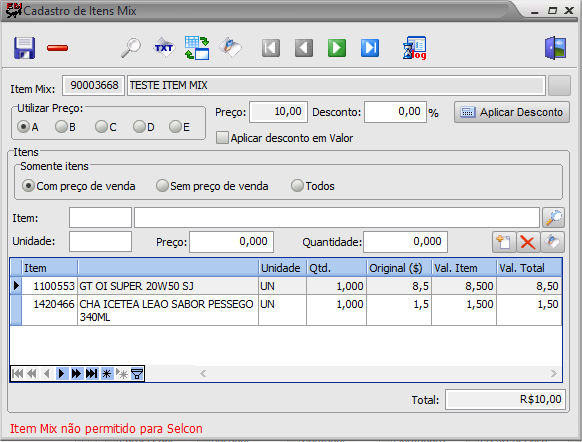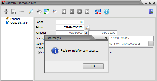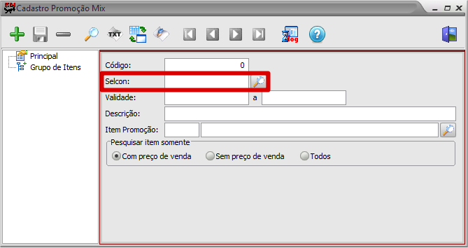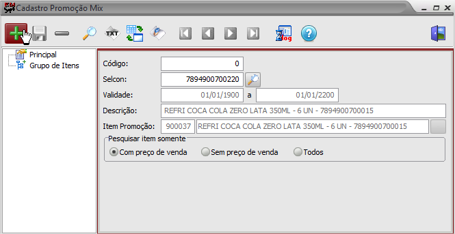 Após, concluir o cadastro do Item SelCon, e incluir o item, será possível inserir a promoção mix, pois o item já estará cadastrado.