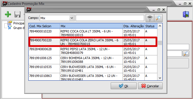 Pesquise novamente a promoção mix no qual o item foi cadastrado e selecione para incluir: