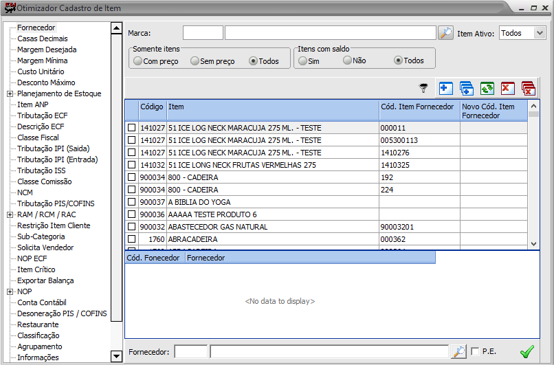 Exemplos como, Marca, Descrição, Tipo Item, Unidade, Classificação, são umas das opções tiradas do otimizador de cadastro de itens. Se na mesma base de dados existir outras empresas que não utilizam a integração com o SelCon, o otimizador funcionará de forma normal, mas não serão apresentados os itens relacionados ao SelCon.