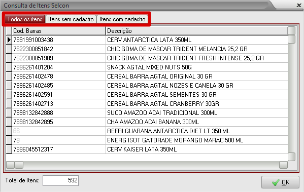 Onde o sistema tem opção de mostrar na tela, todos, itens sem cadastro e itens com cadastro, além de mostrar as quantidades no campo abaixo.