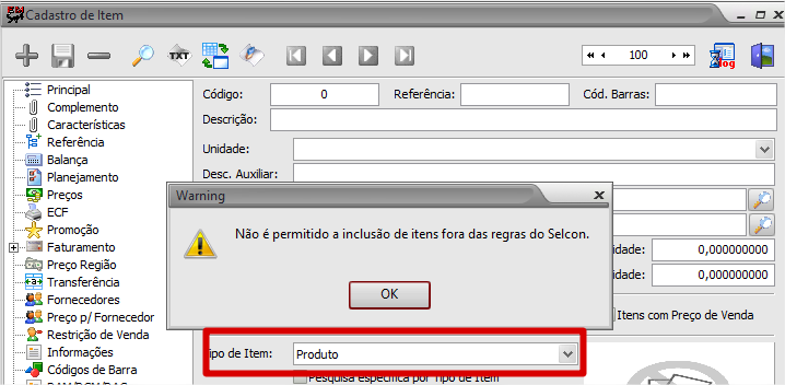 Quando a empresa utiliza o SelCon, não é permitido cadastrar produtos novos.