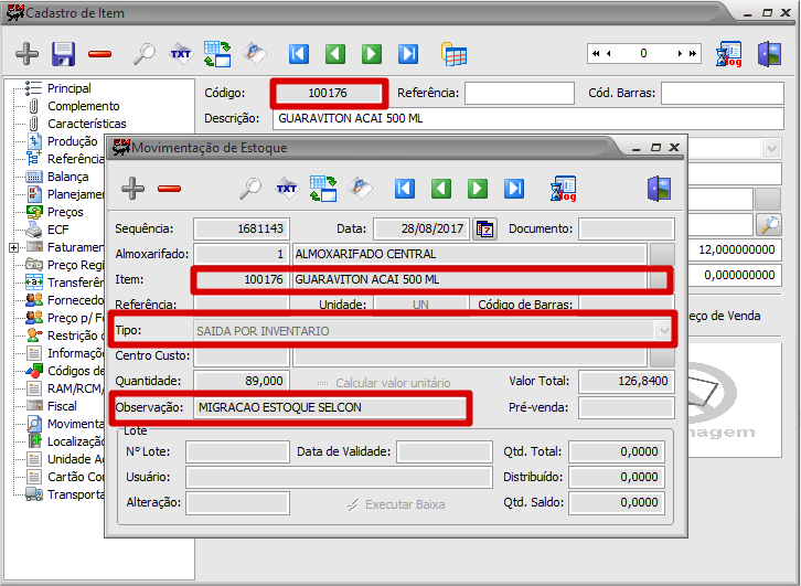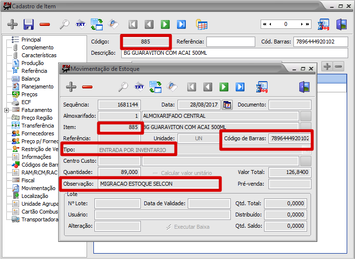 Após realizar a carga Full do SelCon, a Monitoria vai realizar a transferência de estoque para o cadastro que ficará como principal, o sistema realizará uma saída por inventário no item que será migrado e uma entrada de inventário no item que recebeu migração, como mostra na imagem.