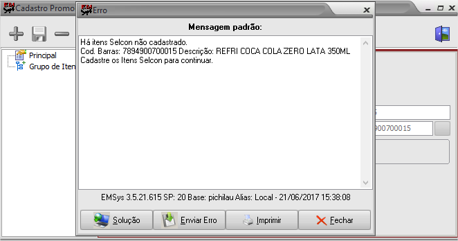 Ao incluir a promoção, pode acontecer de os itens da promoção não estarem cadastrados no sistema, como mostra na imagem.