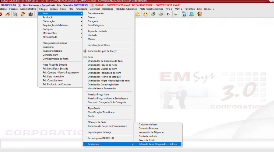 Relatório que mostra os itens que foram bloqueados para compra após uma carga e que ainda possuem saldo de estoque positivo, o relatório fica em Estoque > Item > Relatórios > Saldo de Itens Bloqueados – SelCon.