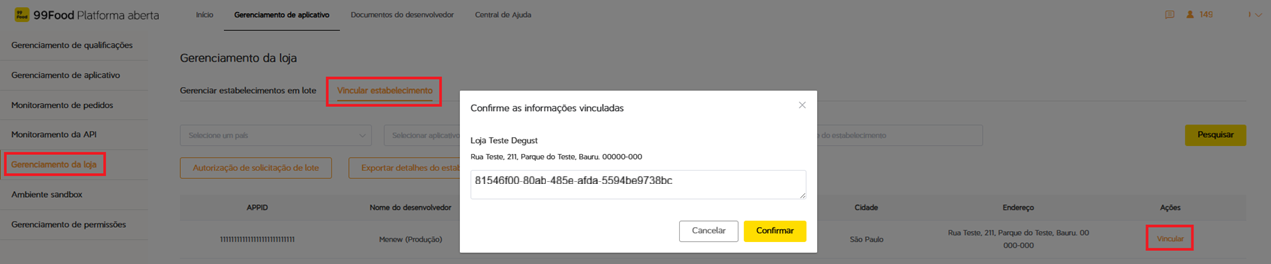 - Loja vinculada com sucesso no portal de desenvolvedor da 99 Foods.