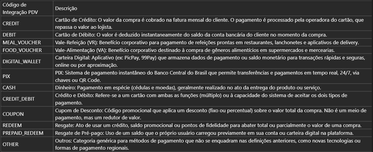 - Formas de pagamento da 99 Foods mapeadas no sistema.