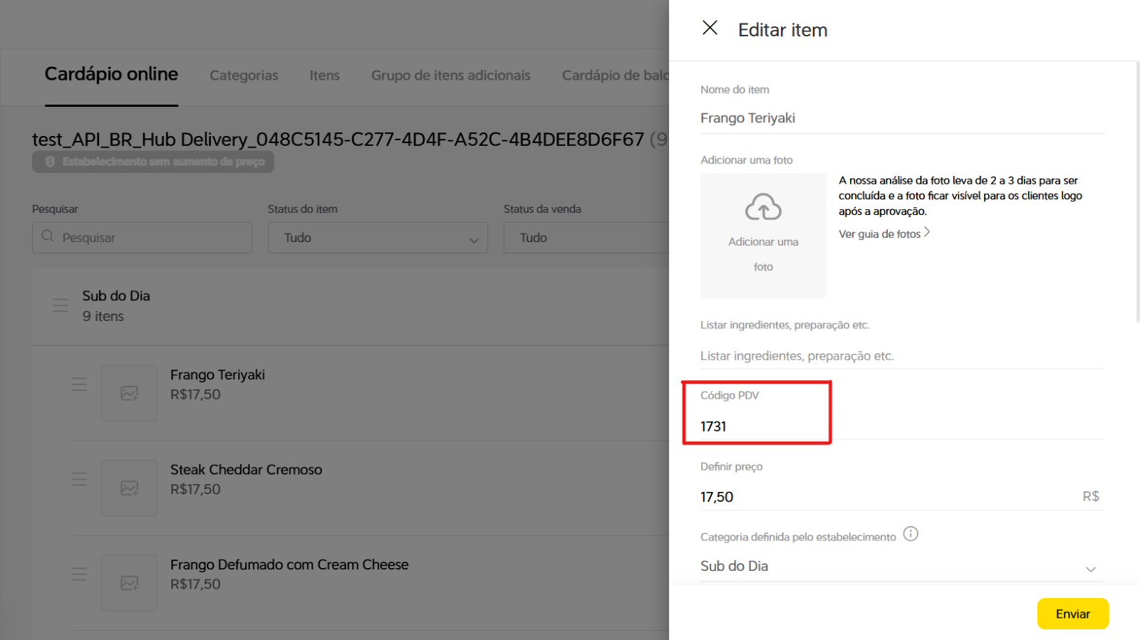 - No painel da loja, acesse o menu de Cardápio.