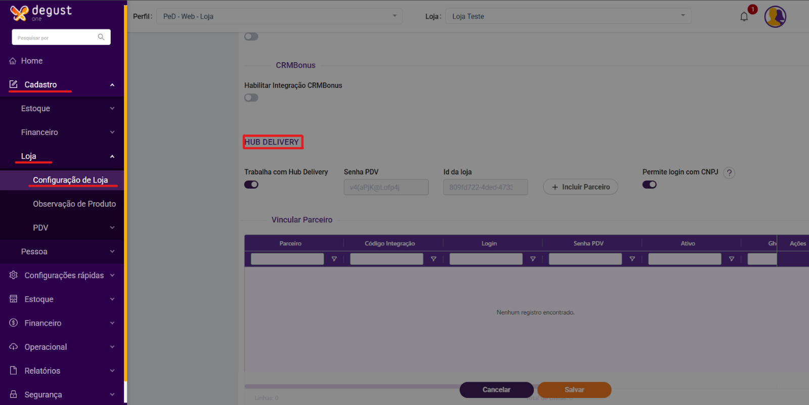 Cadastro > Loja > Configuração de Loja > Aba "Hub Delivery"