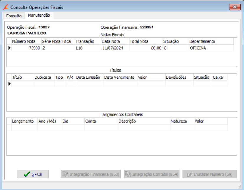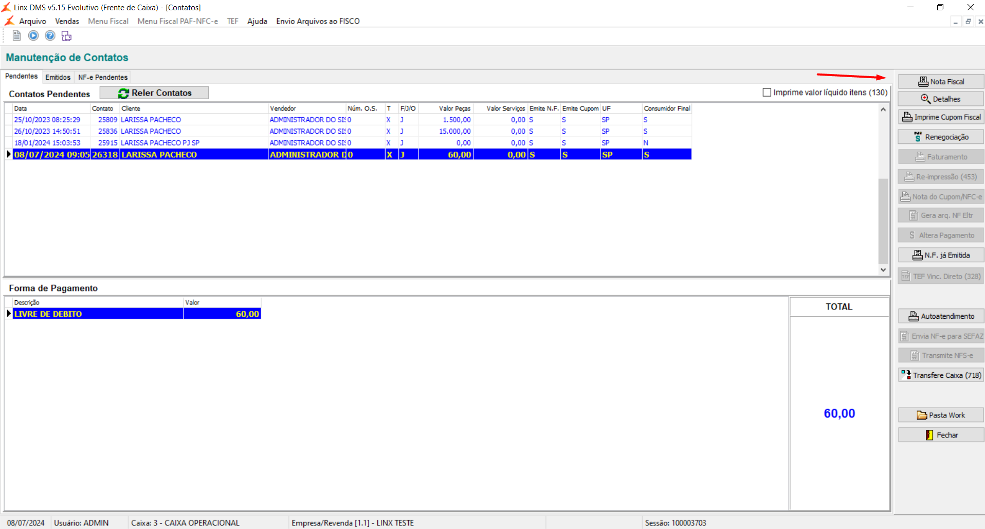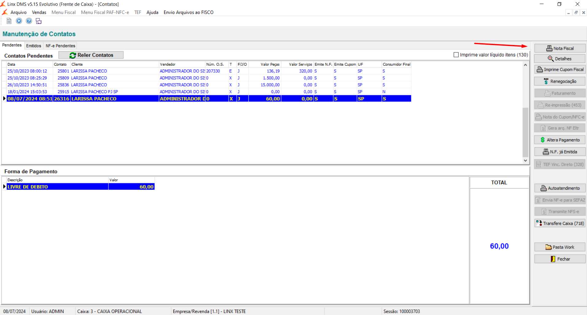 Dentro do Frente de Caixa, agora basta só emitir a nota fiscal, feito isso a peça continuará como Terceiros, e dentro da aba Terceiros na consulta de itens, irá trazer as informações da nota fiscal de remessa.