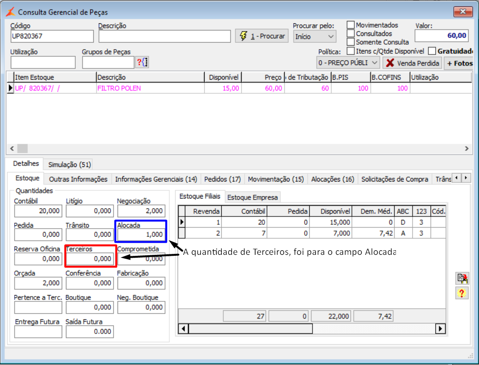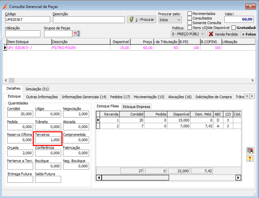 A peça já requisitada com romaneio emitido fica com a quantidade dentro do campo Terceiros.