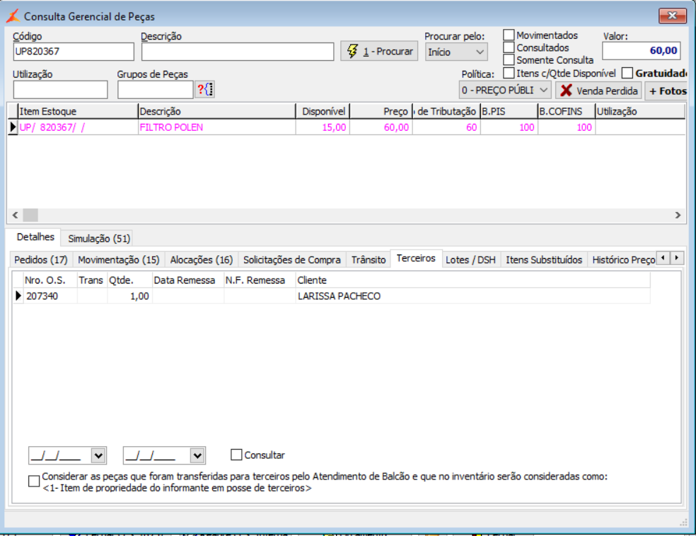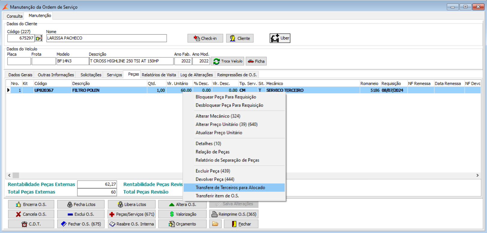 Dentro da ordem de serviço em questão, as informações da nota fiscal de remessa e a data da remessa, irão ficar em branco. Além disso, a peça continua com a situação T(Terceiros) mesmo com a nota cancelada. Portanto para conseguirmos dar andamento no processo, precisamos clicar com o botão direito na peça e selecionar a opção Transfere de Terceiros para Alocado.