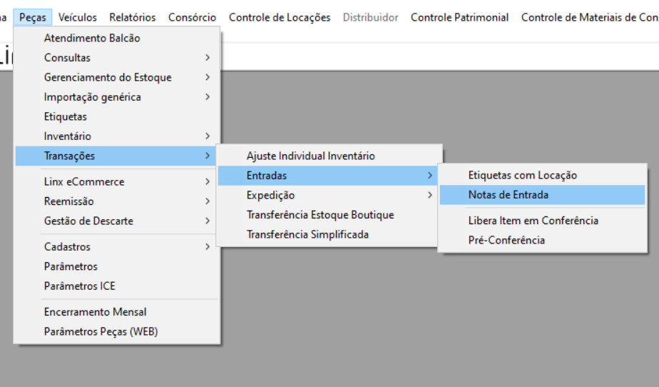 Para fazer o retorno dessas peças, precisa ser feito a entrada delas, então acesse o menu: Peças > Transações > Entradas > Notas de Entrada.