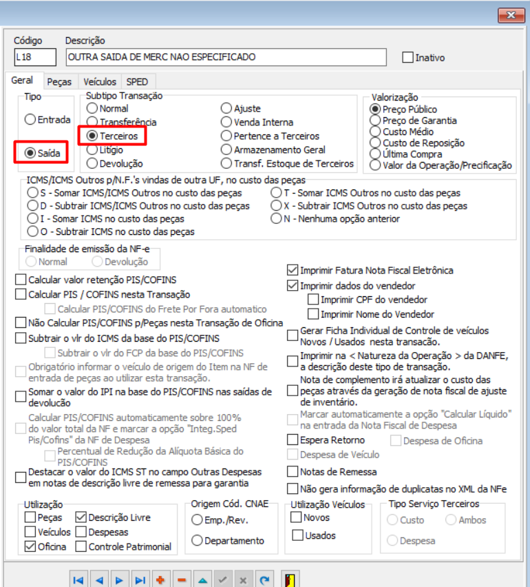 Portanto, dentro do menu: Faturamento > Cadastros > Tipos de Transação, vamos parametrizar a transação de saída, que será utilizada na nota fiscal de remessa de peças, a transação precisa estar com o Tipo igual a Saída e o Subtipo Transação igual a Terceiros.