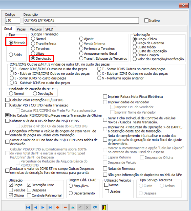 Já a transação de entrada, que será utilizada na devolução da nota fiscal de remessa, ou seja, as peças estarão retornando para o sistema, essa transação deverá estar com o Tipo igual a Entrada e o Subtipo Transação igual a Devolução.