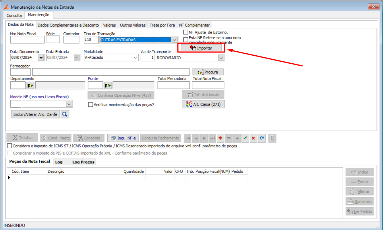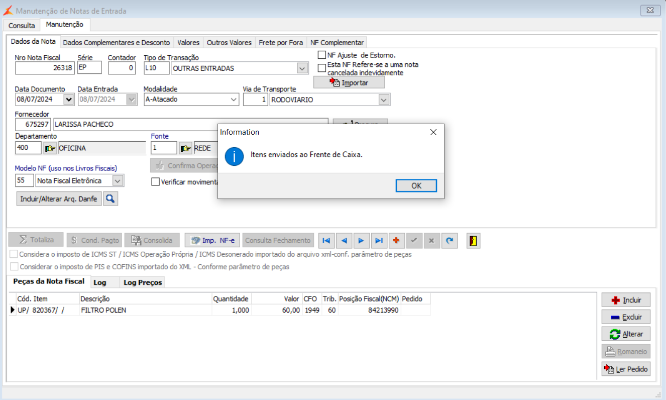 Feito isso, continue o processo normal de entrada de peças, informando os dados solicitados em tela conforme necessidade. Totalize a nota, informe uma condição de pagamento e consolide a mesma, assim a nota irá para o frente de caixa para emissão.