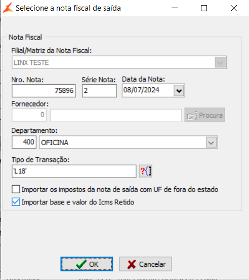 Será aberto uma nova tela, para ser informado a nota fiscal que deseja importar, nesse processo vamos informar os dados da nota fiscal de remessa que fizemos a saída anteriormente. Após completar todos os campos com as informações, clique no botão Ok.