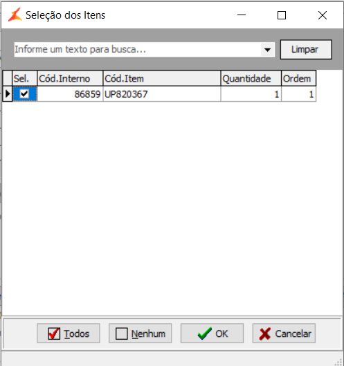 O sistema irá identificar essa nota, e trazer em tela os itens da nota fiscal de remessa, selecione os itens, considerando todos os itens, os aplicados no veículo e também os que não foram utilizados no serviço.