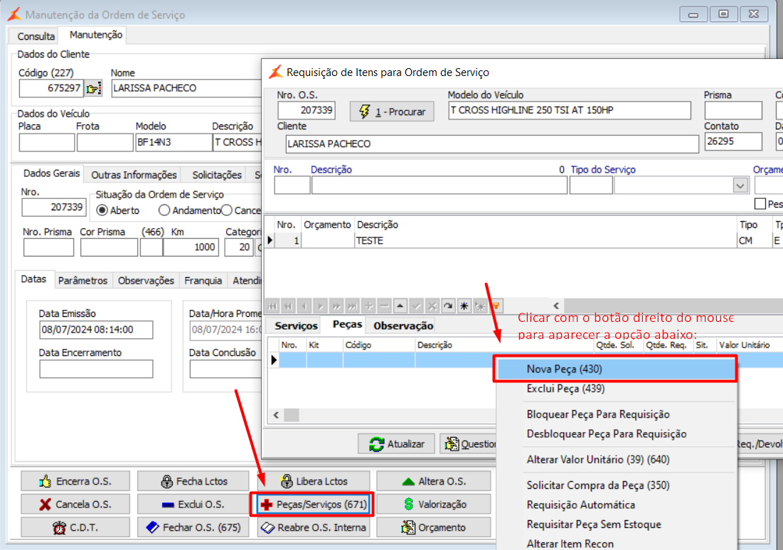 Após a abertura da ordem de serviço conforme passos anteriores, precisa ser incluso algumas peças, para que seja realizado o serviço externo. O passo a passo para incluir as peças, segue o mesmo padrão de qualquer outra ordem de serviço, porém a situação da peça fica diferente do habitual, quando a peça é incluída na O.S a quantidade informada fica como Orçada na consulta do item, em seguida da inclusão das peças quando for requisitar, normalmente o situação da peça fica R. Já no processo de atendimento de campo/atendimento externo, a situação da peça fica como T e dentro da consulta do item a quantidade de Orçada vai para o campo Terceiro. Segue abaixo passo a passo para inclusão de peças.