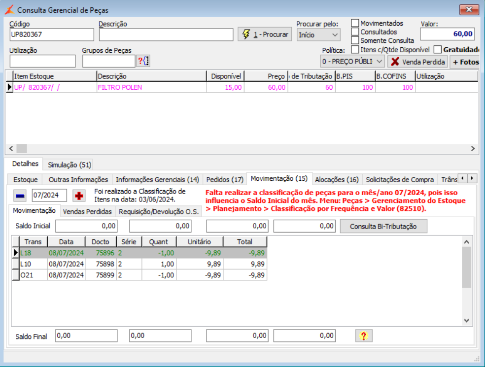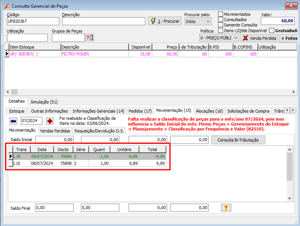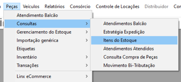 Com esse processo feito, antes de emitir a nota fiscal de remessa, na tela de consulta de itens menu: Peças > Consultas > Itens do Estoque.