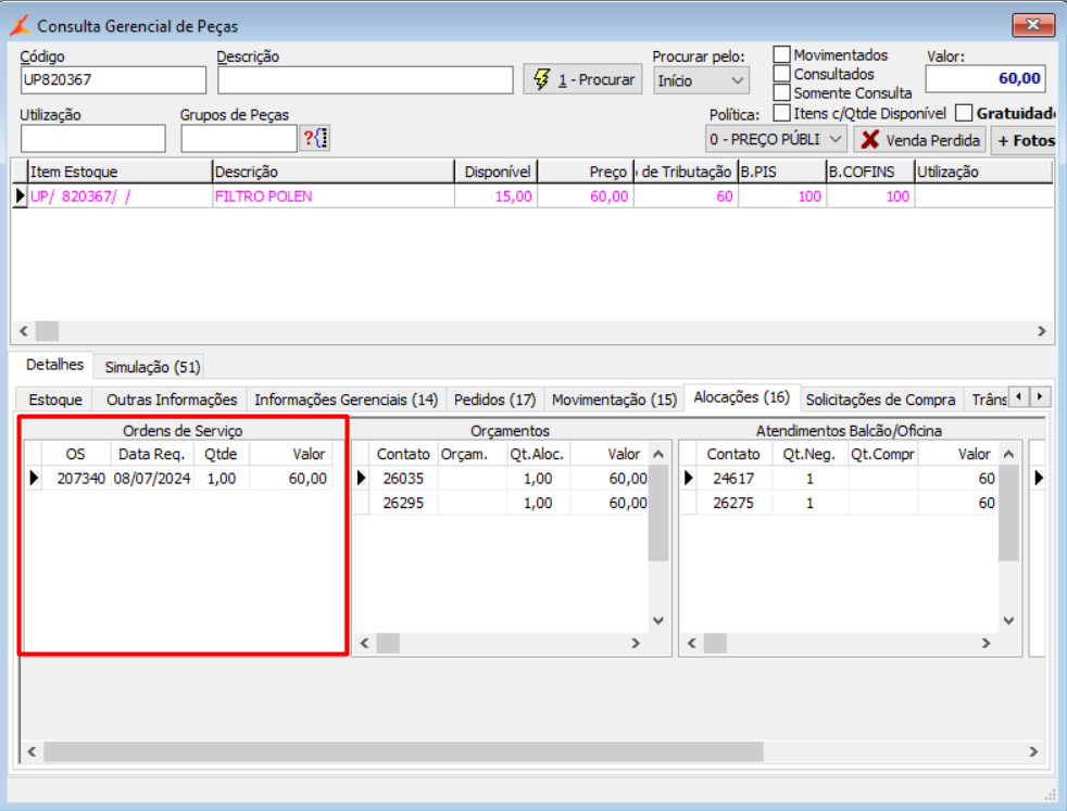 Com a entrada feita, os itens irão sair do campo Terceiros e irão para o campo Alocada, na aba Movimentação(15) mostra as transações feitas, a nota fiscal de saída de remessa e o retorno da mesma. Na aba Alocações(16) é informado a ordem de serviço que a peça está alocada, e na aba Terceiros as informações que estavam contidas anteriormente não irão mais aparecer.