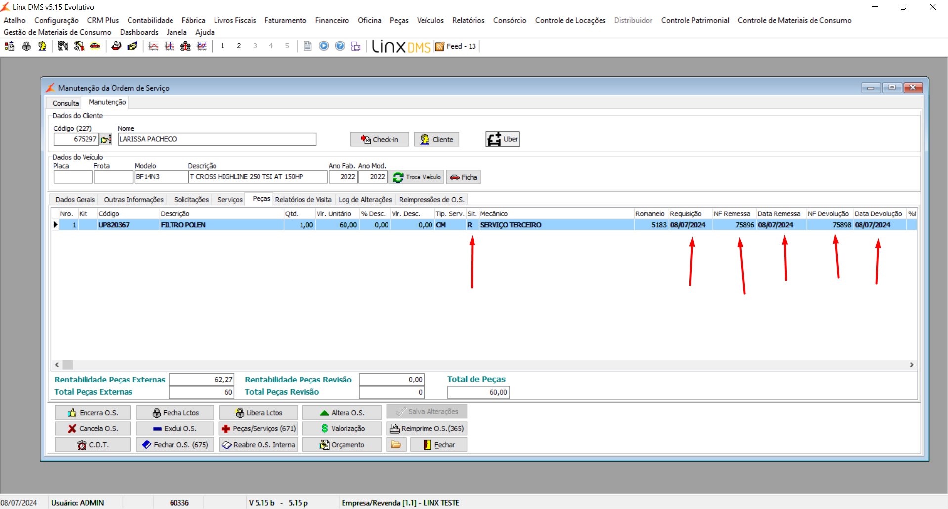 Com a nota fiscal de entrada finalizada, as peças voltam para a ordem de serviço, dentro da aba Peças a situação das peças ficam como R(requisitada), além disso os campos RequisiçãoNF RemessaData RemessaNF DevoluçãoData Devolução são preenchidos.
