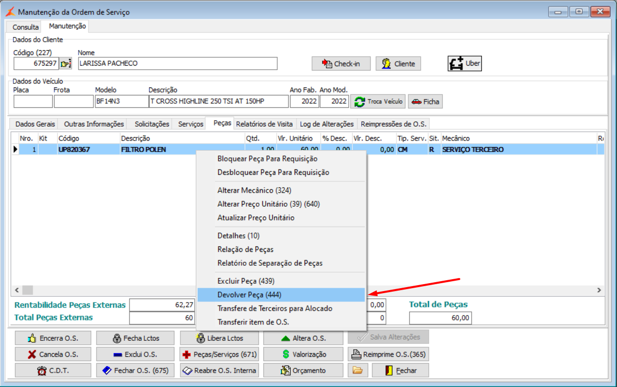 Caso alguma peça não tenha sido utilizada no atendimento de campo/atendimento externo, ou por algum outro motivo precise ser devolvida ao estoque, com os itens requisitados dentro da O.S, temos a opção de fazer a devolução simplesmente clicando com o botão direito do mouse em cima da peça requerida e selecionar a opção Devolver Peça(444), após isso seguir o processo normal de devolução de peças dentro da O.S.