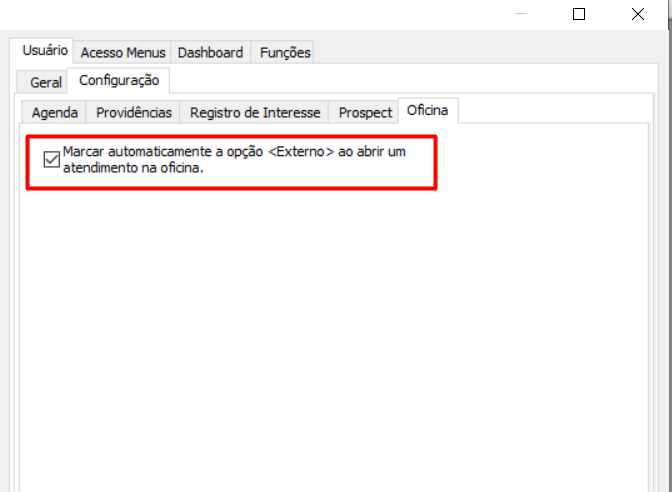Caso o processo sempre seja feita por um usuário específico, ou caso queira que sempre o campo venha preenchido, acesse o menu: Configuração > Cadastros > Menus / Usuários > Usuários e Permissões, selecione o usuário desejado, na aba Usuário, sub aba Configuração, sub aba Oficina, ative a opção Marcar automaticamente a opção <Externo> ao abrir um atendimento na oficina.