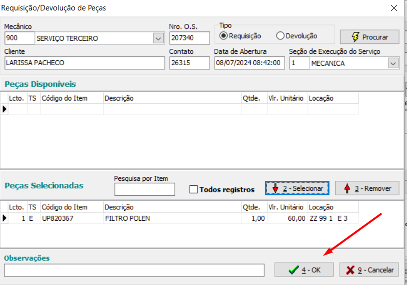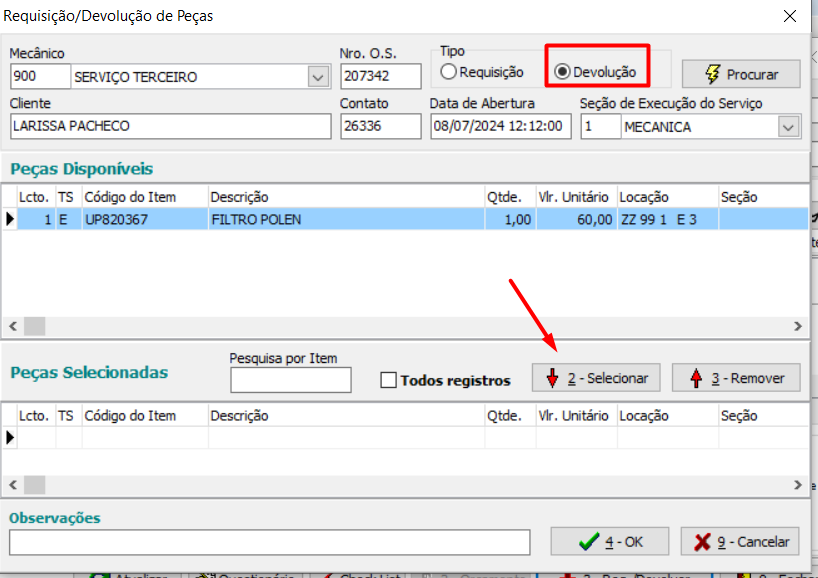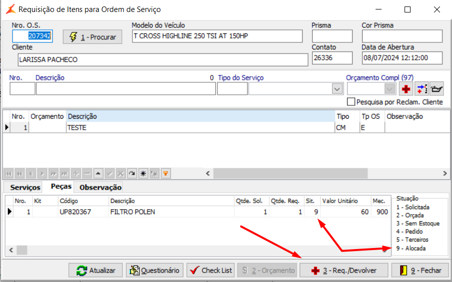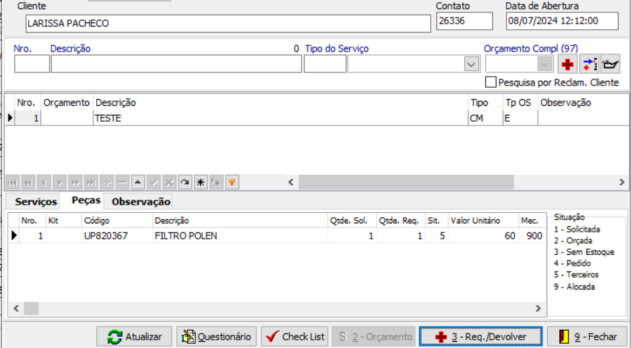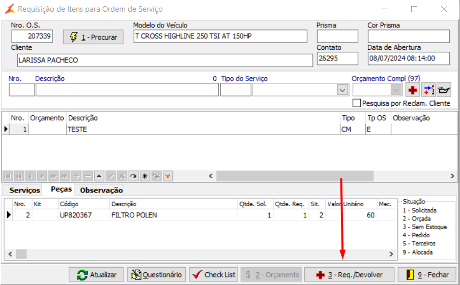 Feito o processo, a peça ficará com a situação R(Requisitada), portanto, agora vamos fazer o processo da emissão do romaneio de devolução, para retornar essa peça ao estoque.