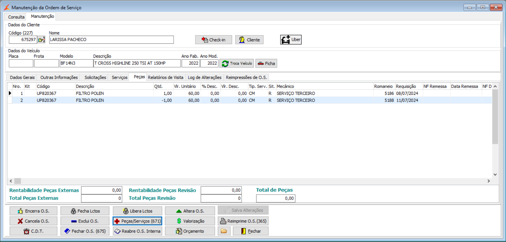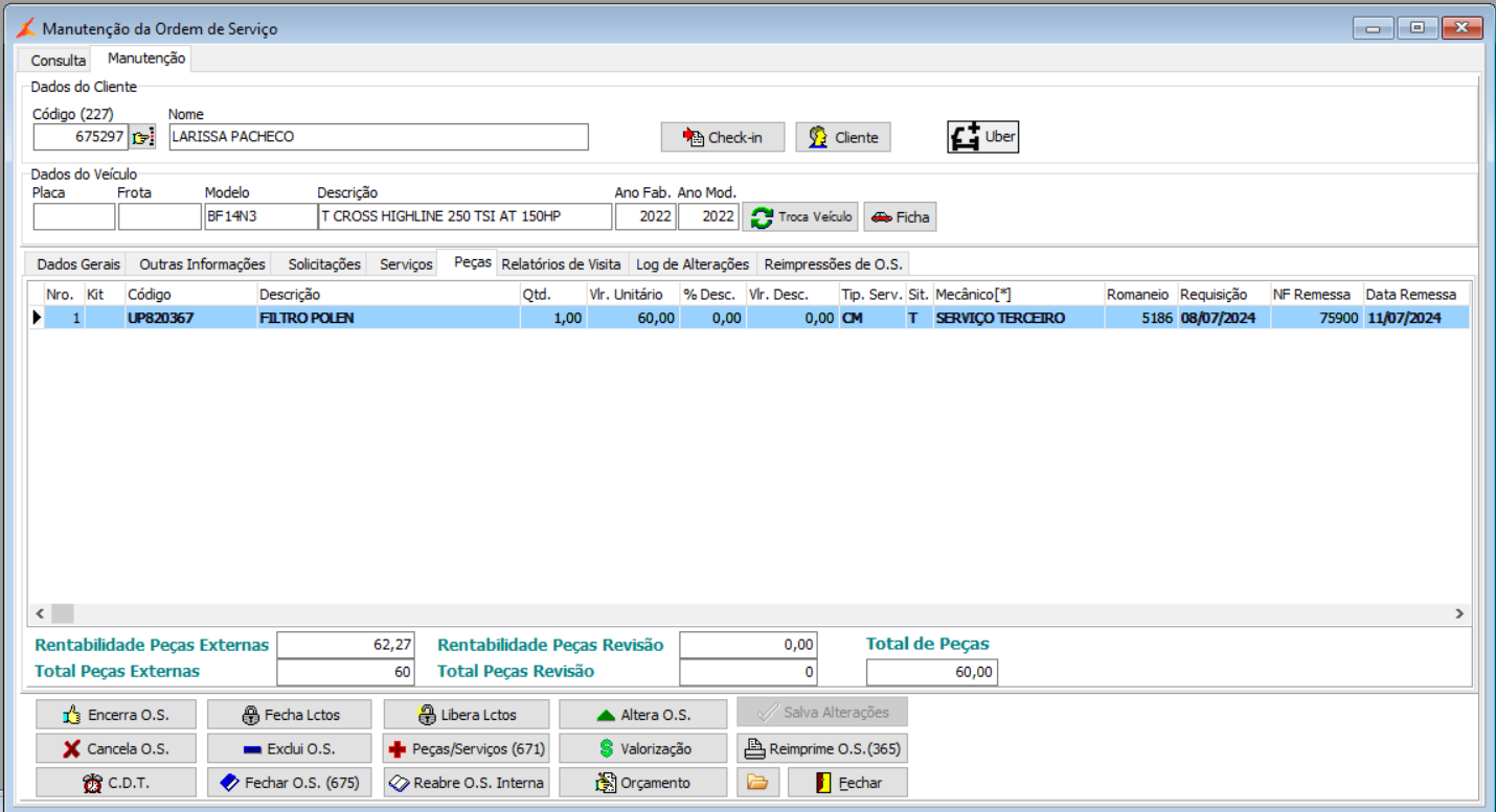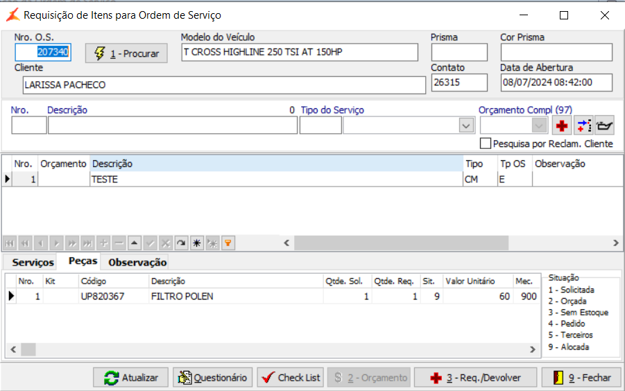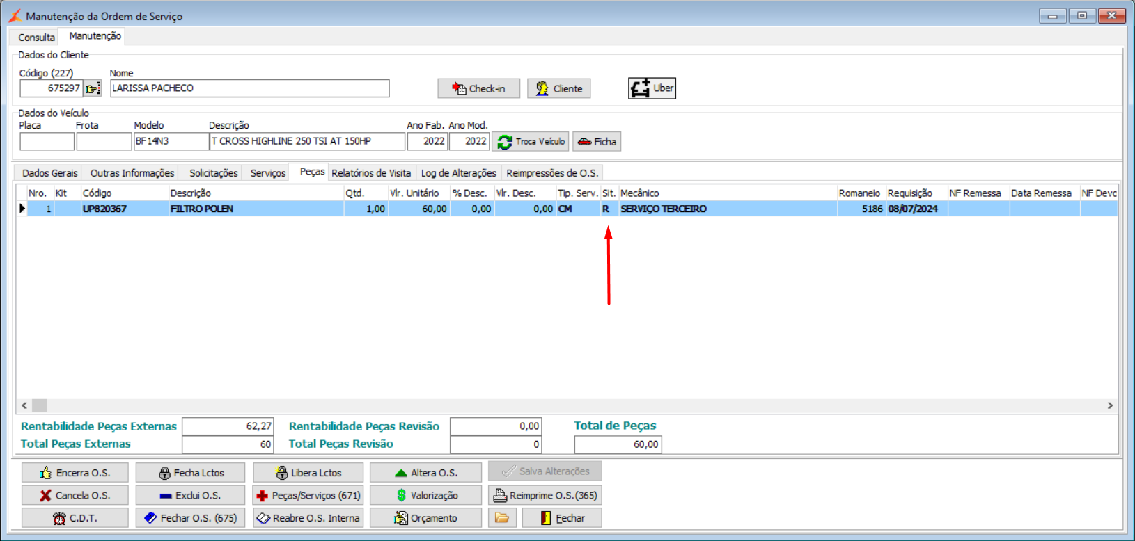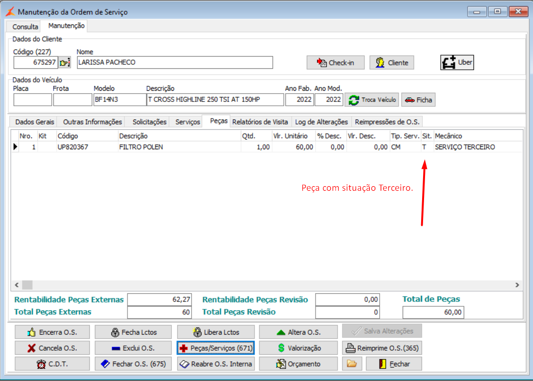 Conforme descrito anteriormente, após a requisição das peças, a situação da peça fica como T(Terceiros).