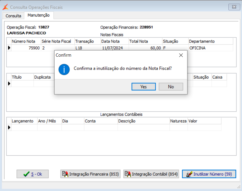 Acesse o menu: Faturamento > Consultas / Relatórios > Operações Fiscais, busque pela nota fiscal em questão, clique no botão Inutilizar Número(59), ao aparecer a mensagem se confirma a inutilização, clique no botão Yes.