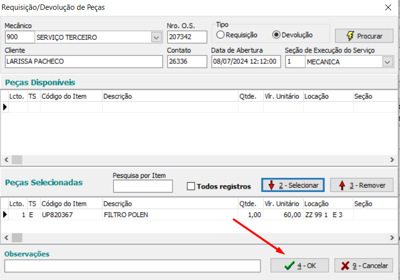 Assim a peça ficará devolvida dentro da ordem de serviço, e para fazer uma nova nota de remessa, precisará ser incluída novamente, iniciando o processo a partir da parte de inclusão de itens na ordem de serviço.