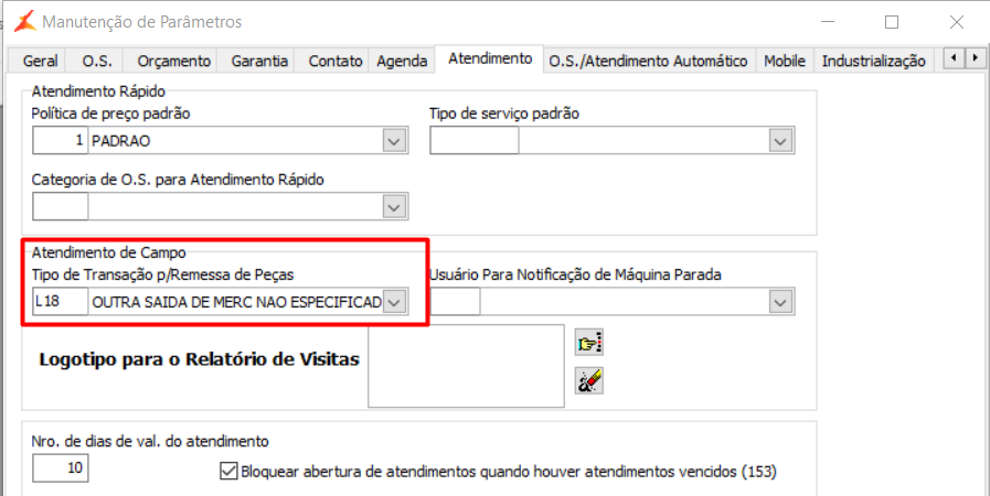 Para realizar o processo de atendimento de campo/atendimento externo, será necessário ter uma Transação Padrão para as notas de remessa. Acesse o menu: Oficina > Parâmetros > Módulo>Aba Atendimento, preencha o campo Atendimento de CampoTipo de Transação p/Remessa de Peças com a transação de saída configurada no passo anterior.