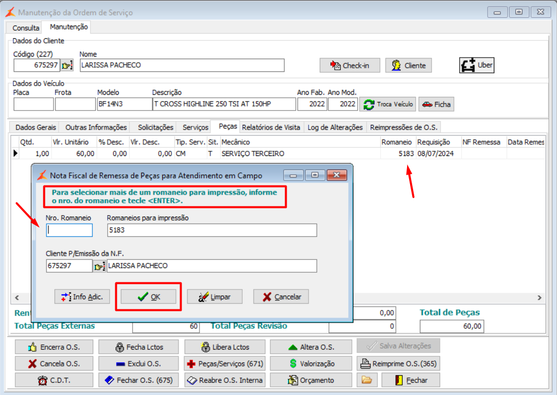 Irá abrir uma tela, onde é preciso informar no campo Nro. Romaneio, na qual deve ser preenchido com o número do romaneio conforme gerado ao requisitar as peças, feito isso, clique no botão Enter no teclado, após esse processo clique na tecla Tab do seu teclado, assim o campo Cliente P/Emissão da N.F. será preenchido automaticamente com o código e nome do cliente da ordem de serviço.