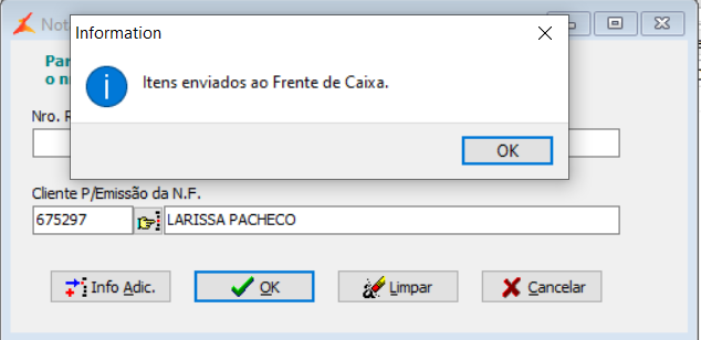 Após informar a condição de pagamento, os itens foram enviados ao Frente de Caixa.