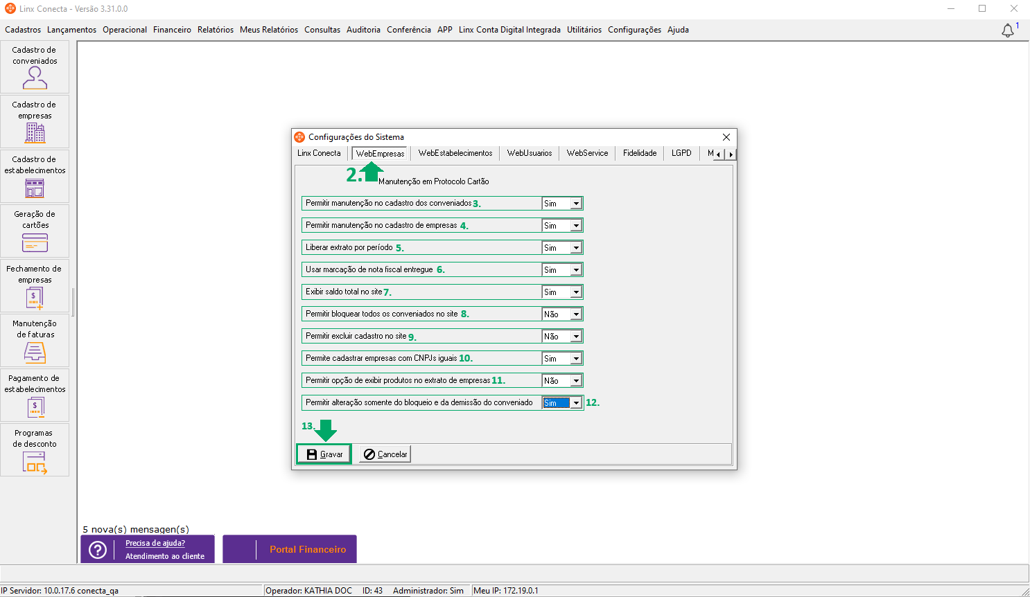 12. No campo de 'Permitir alteração somente no bloqueio e na demissão do conveniado', selecione a opção 'Sim' para permitir a alteração apenas dos campos 'bloqueado' e 'demitido' ou 'Não';