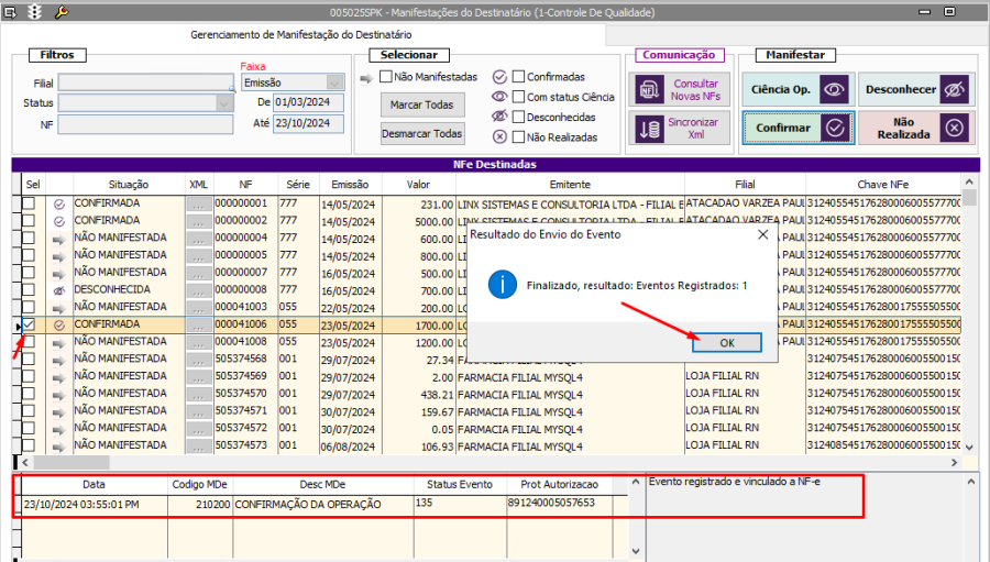 O evento de “Confirmação da Operação” pelo destinatário confirma a operação e o recebimento da mercadoria (para as operações com circulação de mercadoria).
