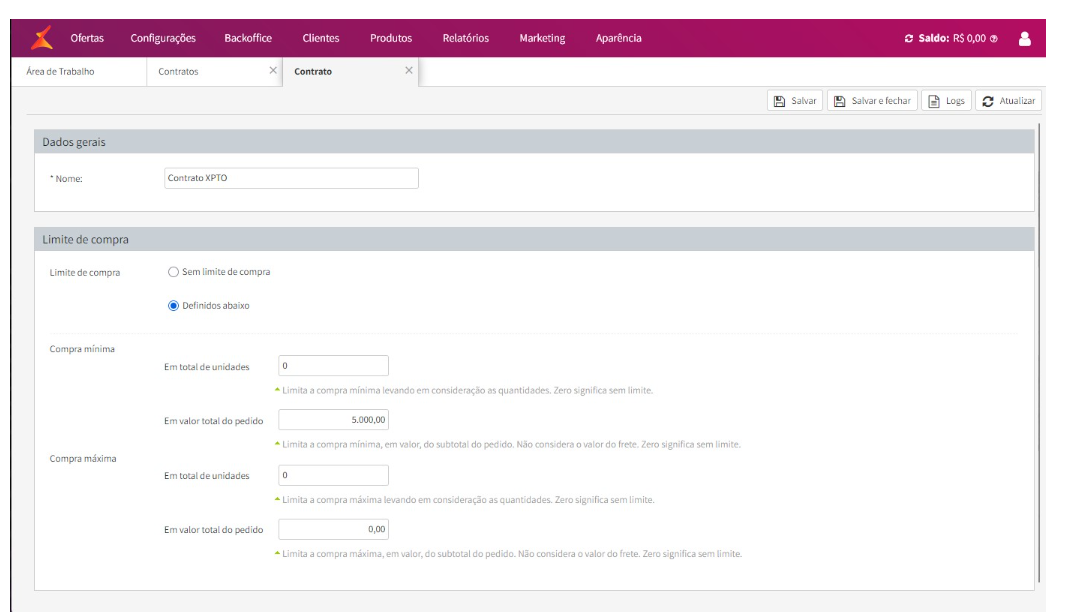 Ao vincular um contrato com valor mínimo a um grupo, o sistema valida os valores configurados no fechamento do pedido.