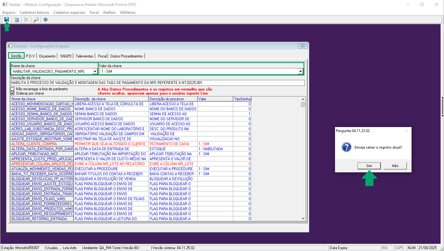 4. Na aba 'Gestão', no campo 'Nome da chave', selecione o a opção de 'HABILITAR_VALIDACOES_PAGAMENTO_NFE';