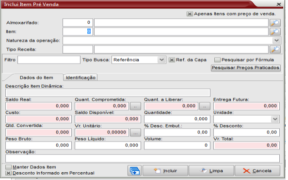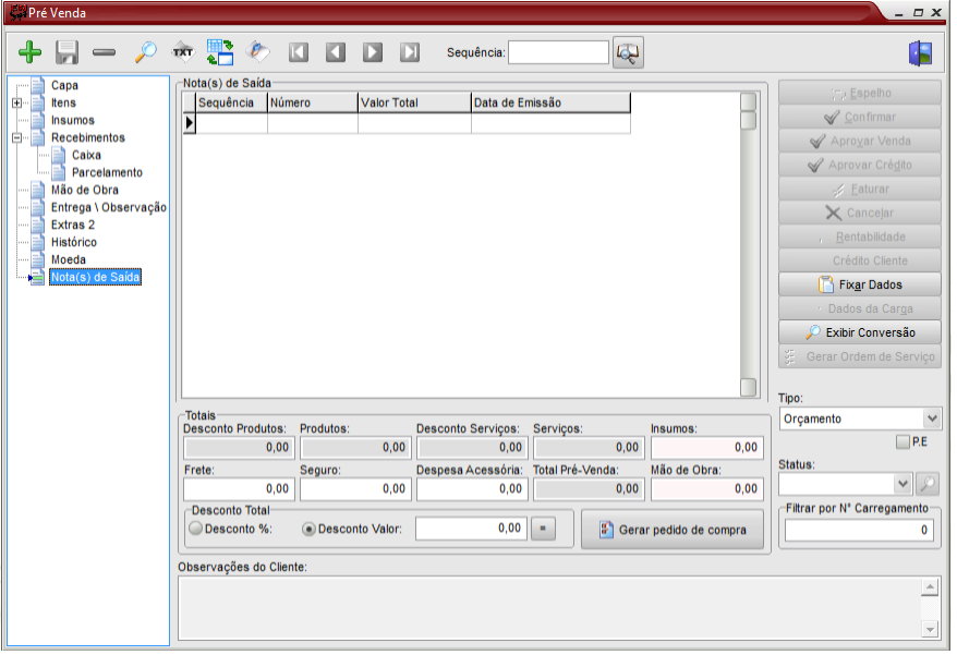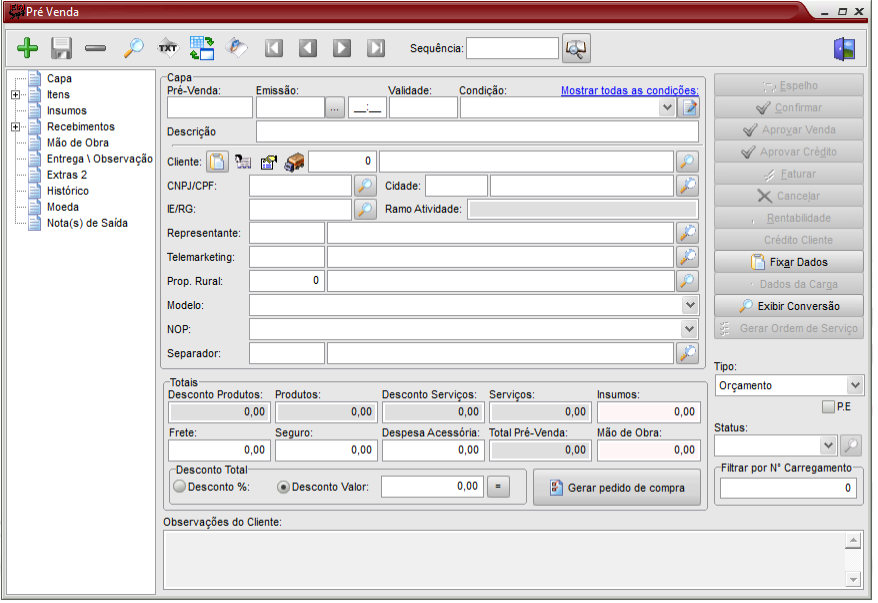 Abre-se a tela principal da pré-venda e preenche-se com os dados básicos do cliente. A seleção da forma de pagamento será verificada no item que tem preço especial para o cliente e sua forma de pagamento. Seleciona-se também a natureza de operação que comandará os reflexos na geração da nota fiscal: estoque, imobilizado, financeiro, etc.