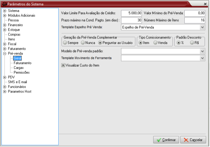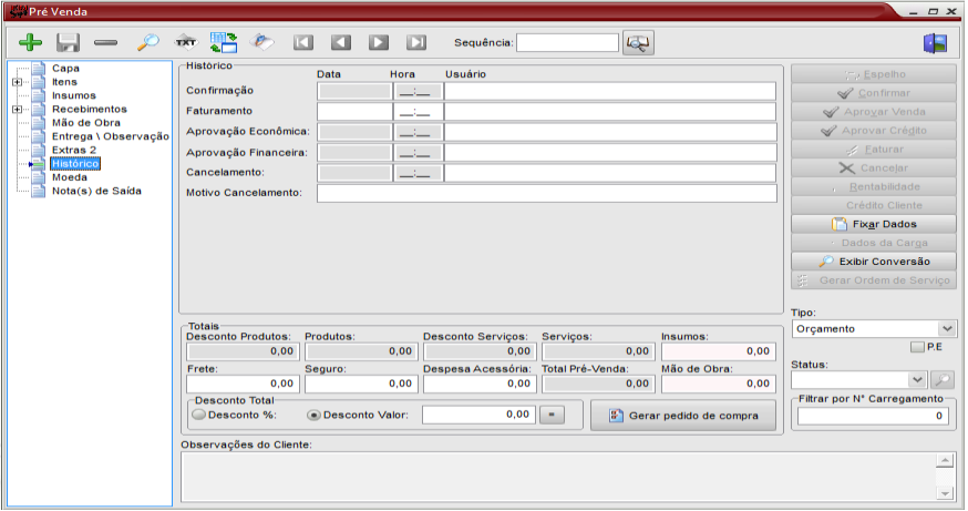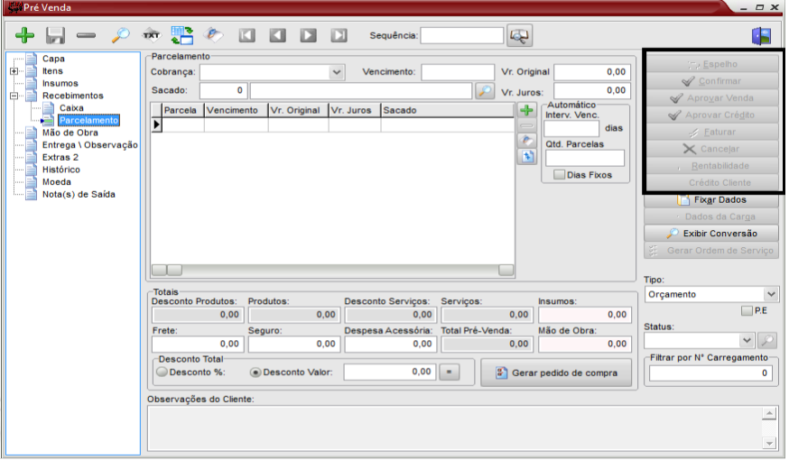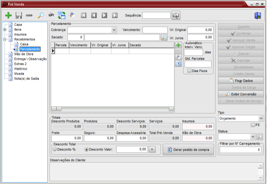 Os tipos da pré-venda que podem ser selecionados é o de Orçamento – o mais utilizado, pois se converte em pedido. Os demais são restritos a atividades específicas.