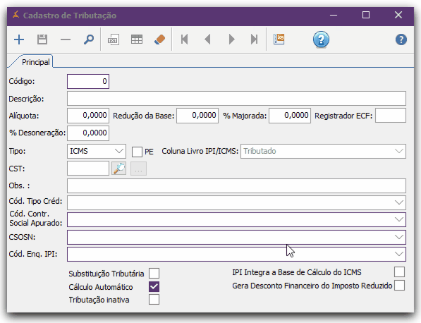 Cadastro de Tributação - Tipo ICMS