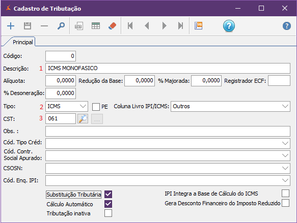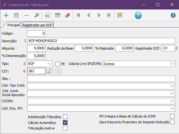 Ainda na tela de Tributação, cadastre agora uma tributação do Tipo ECF., também com o CST 061.
