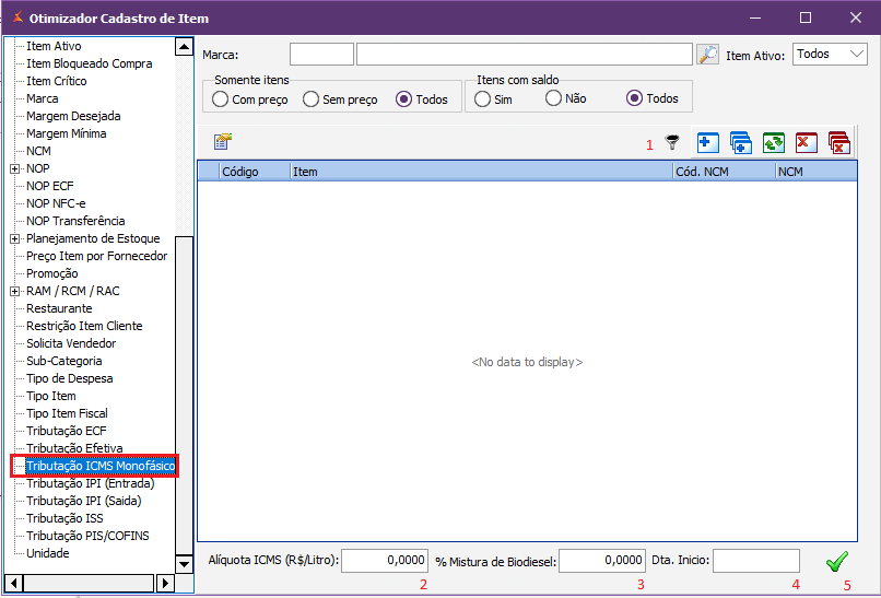 Para os usuários que trabalham na modalidade multi-empresas, foi adicionado uma opção no Otimizador de Cadastro de Item → Tributação ICMS Monofásica Combustível.