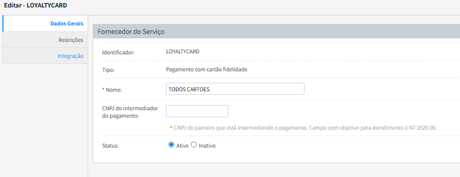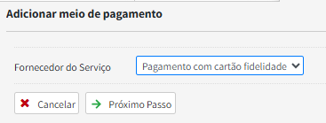 - Configs → Meios de Pagamento → Adicionar meio de pagamento → Pagamento com cartão fidelidade → Próximo Passo