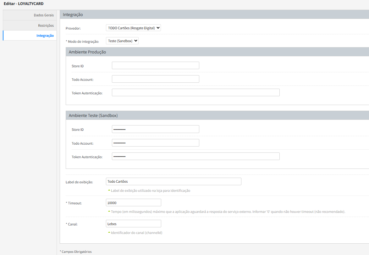 - Timeout: Tempo (em milissegundos) máximo que a aplicação aguardará a resposta do serviço externo. - Indicado 10000.