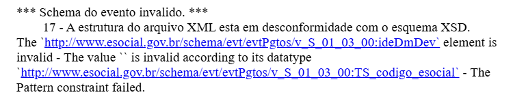 Este erro ocorre no evento S-1210 do eSocial, quando o S-1200 da competência anterior esta com erro na informação da tag ideDmDev no XML.